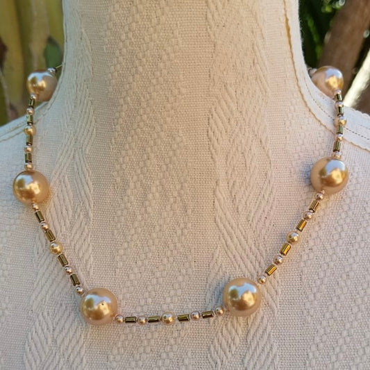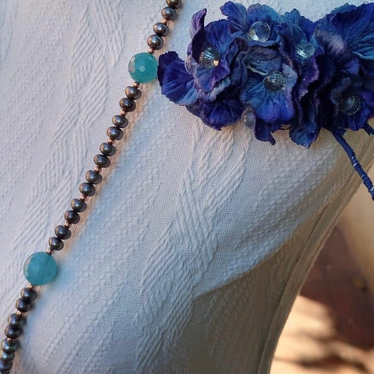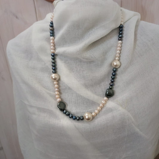75 cm necklace in angelite, aquamarine, mother of pearl and river pearls